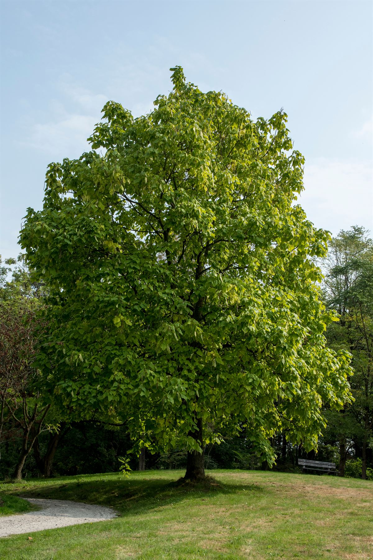Arbre au feuillage dense en forme de coeur d’un beau vert clair. Les belles fleurs blanches à gorge jaune et rouge sont groupées en panicules. La fructification se développe sous forme de longues gousses étroites.