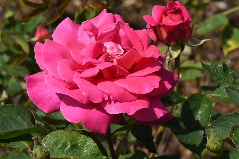 Rosier hybride de Thé à grandes fleurs doubles rose foncé, au parfum fort et au feuillage coriace et vert foncé. Solitaires sur hautes tiges, ces roses font d’excellentes fleurs coupées. Il préfère le soleil et un sol bien drainé. Couper les fleurs fanées afin de prolonger la floraison.