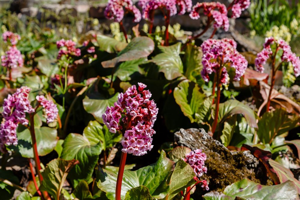 Belle vivace résistante qui se plait dans les sols lourds et humides mais tolère aussi très bien les conditions plus sèches et les sols plus légers. Feuillage persistant, décoratif et à floraison en grappes de couleur rose-rouge, tôt au printemps. Son feuillage lustré et arrondi prend une coloration automnale. Épis de fleurs rose vif portés bien au-dessus du feuillage au printemps.