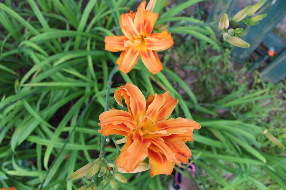 Variation double de la très populaire hémérocalle fulva. Belle fleur orange vif portée bien haute sur sa tige. Peut devenir imposante, diviser au besoin.